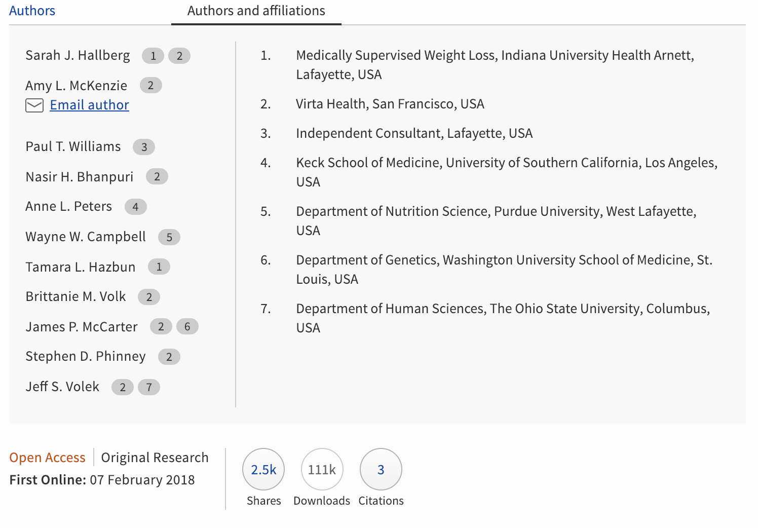 This other study, on the benefits of carbohydrate restriction on diabetes, was funded by a startup that sells ketogenic diet services for $370/month. That raises a red flag. But we can investigate it further. Let’s examine the authors’ affiliations: